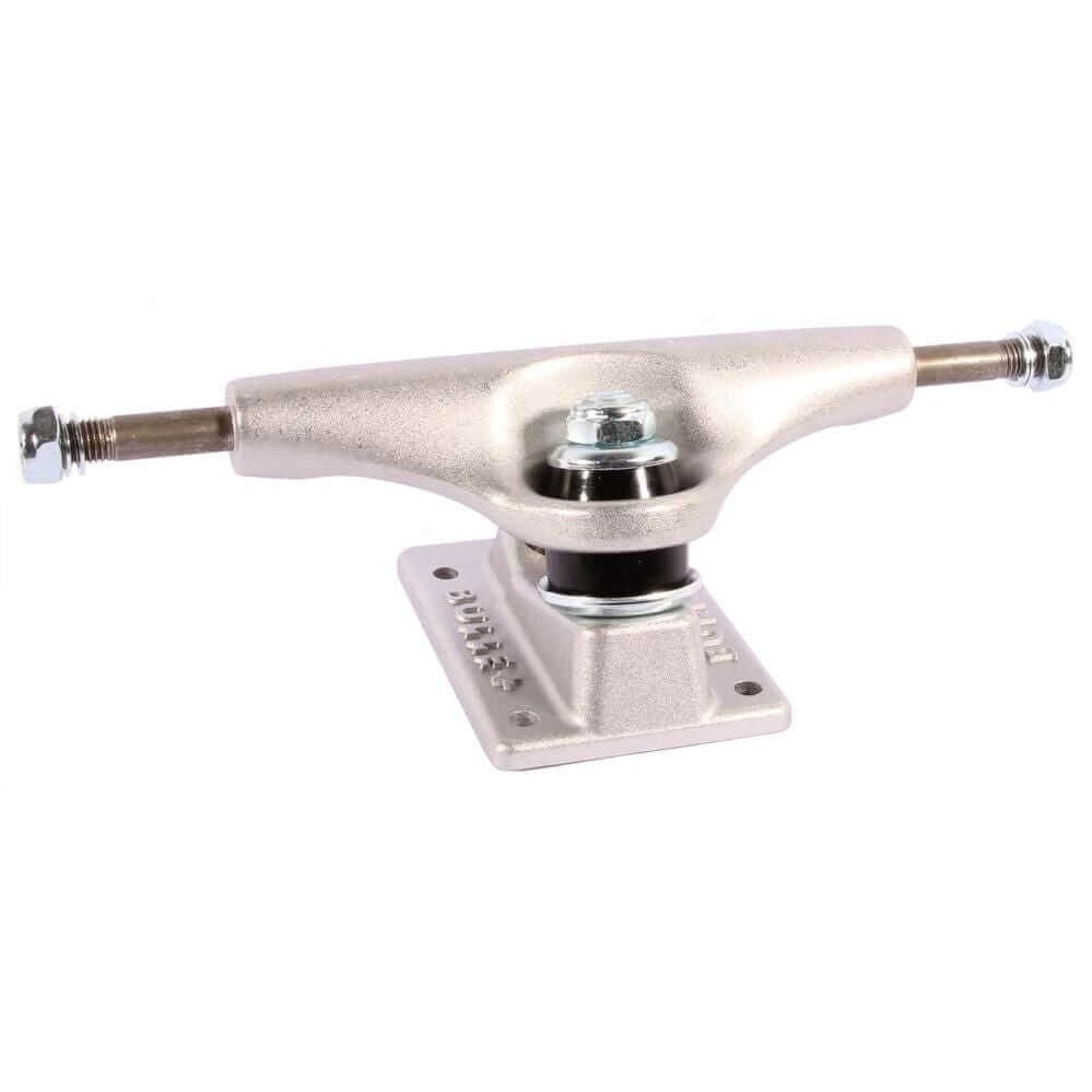 The Bullet 130mm Silver trucks have a classic geometry for all terrain shredding. The trucks come with premium high rebound 88a cushions. Integrated bottom cushion cup. Super strong hanger design. Grade 8 kingpin.