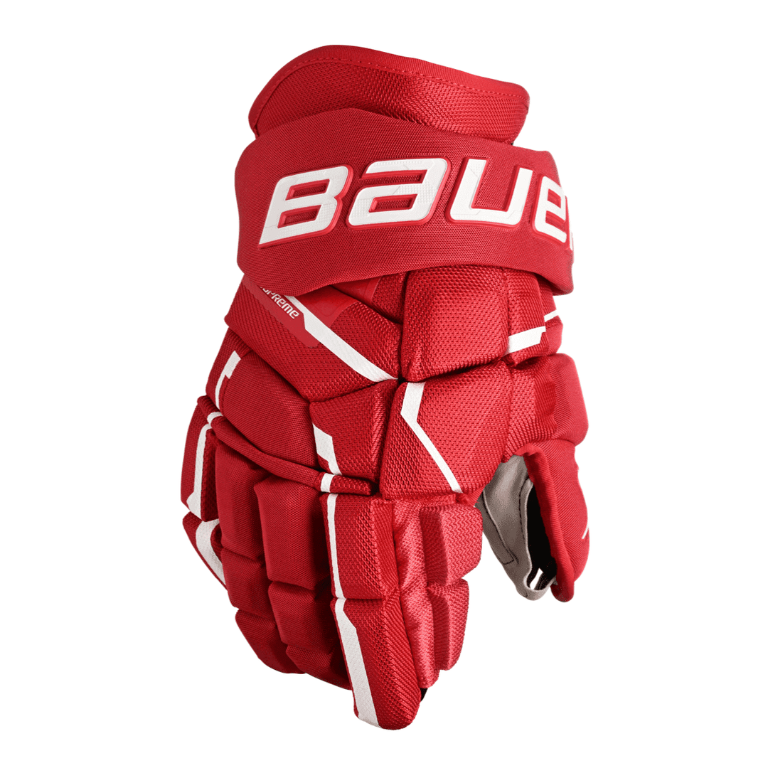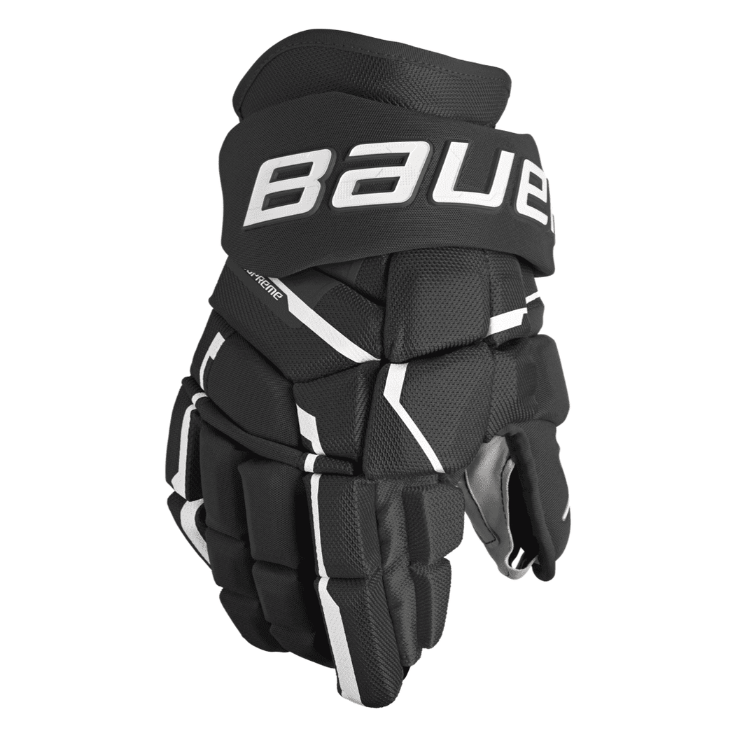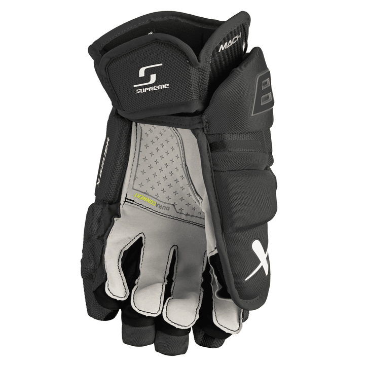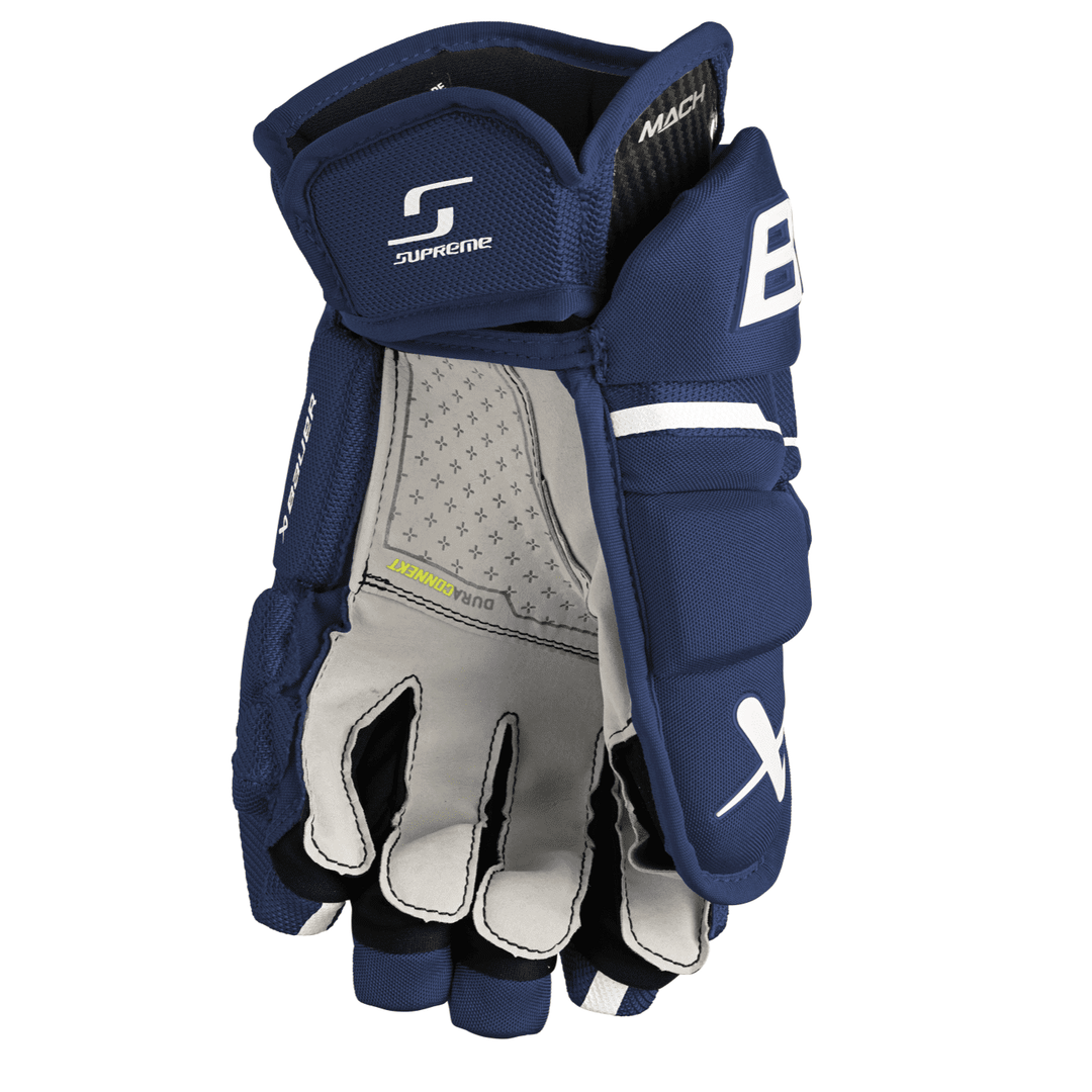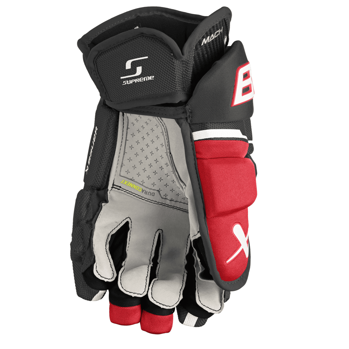 Designed for elite and pro inspired players, the Bauer Supreme Mach Hockey Gloves built for the shooter whilst offering superior protection and improved impact absorption. The CURV composite AMP cuff, 3-SHOX with EPP and DC Tech foam package, and ShotBoost fingers provide exceptional grip, protection and flexibility. The Pro lite Tex cable mesh shell, molded cuffrol and light grey DuraCONNEKT palm offer comfortable wear, while the 3-piece flex thumb and comfort stretch gusset provide added flexibility.