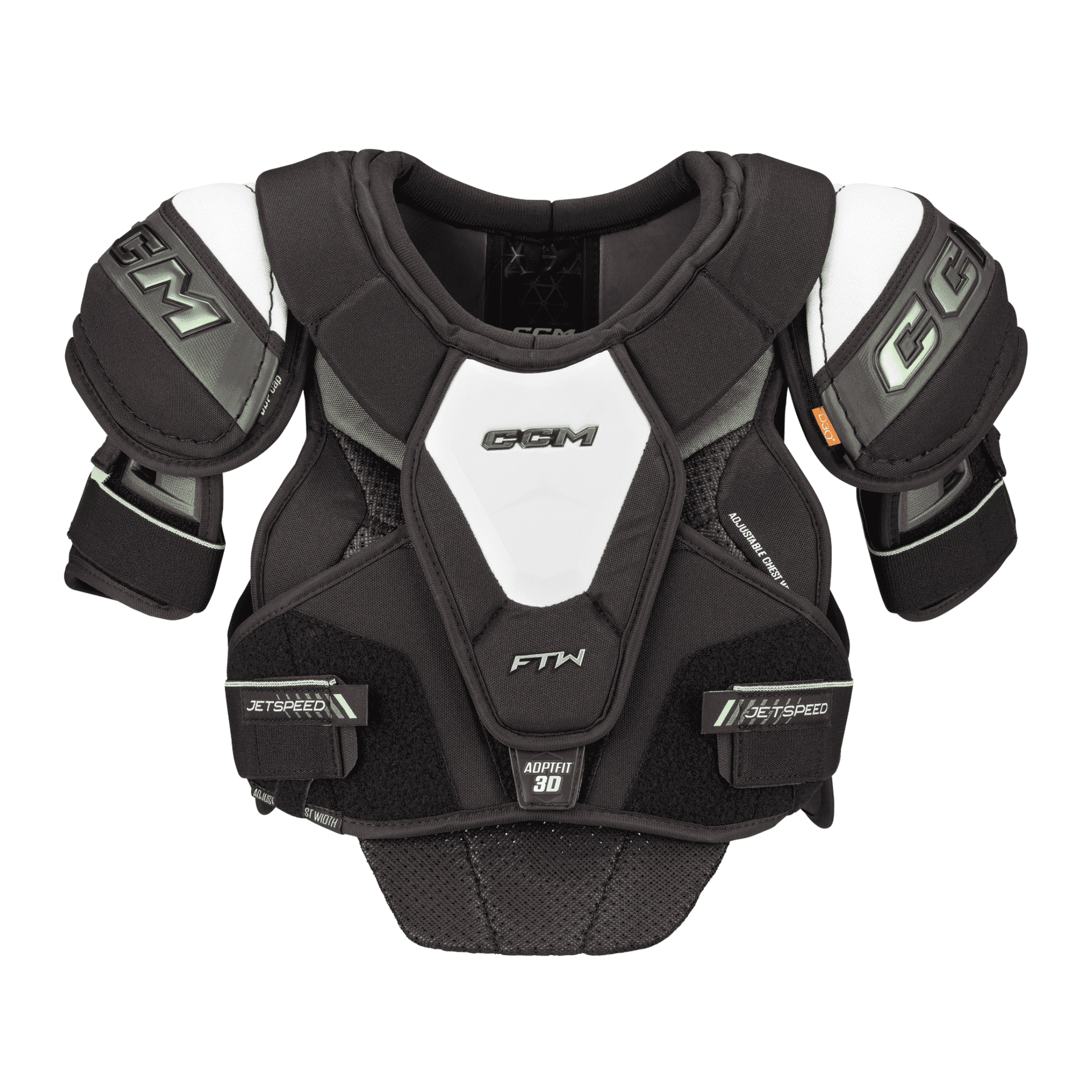 The CCM Women's Jetspeed FTW Shoulder Pads has an adapted enhanced technology allowing maximum protection, mobility and comfort of a female body type of any level. It has a patent-pending adptfit 3D 3-way customisable chest adjustments for optimal fit, protection, mobility and comfort + D30 zero in adapted size JDP shoulder caps and AC joint. The FTW shoulders feature AER-TEC in the bicep protector for improved temperature regulation and interaction with elbow pads.