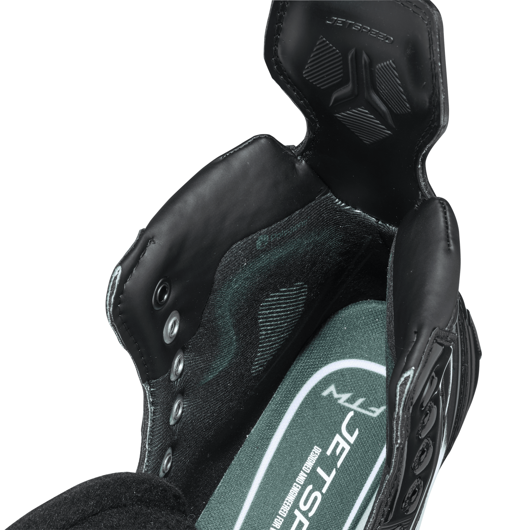 Designed specifically for women, the CCM Jetspeed FTW Ice Hockey Skates feature a tapered silhouette that enhances power transfer and performance. Equipped with a Totaldri Pro liner, these skates keep feet dry and fresh by wicking moisture and combating odor. The exclusive FTW moulded footbed supports higher arches with ADPT memory foam for superior comfort. Advanced technology includes the ADPT Comfort tongue and reinforced tendon and ankle pads for durability and fit. STEP steel runners offer precise edges for optimal control on the ice, making these skates ideal for serious female players seeking top-tier performance.