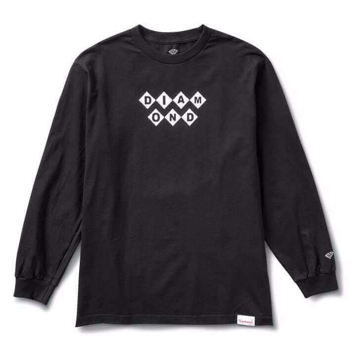 Long sleeve T-shirt with screen print at chest and back, woven clamp label at wearer’s left, interior printed neck label.
